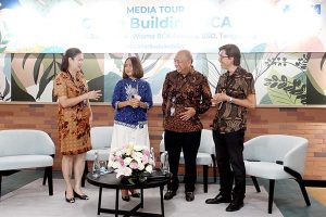 Komisaris BCA Cyrillus Harinowo (ketiga dari kiri) bersama Kepala Sentra Bisnis Komersial Kantor Wilayah XII BCA Ika Maya Sari Khaidir, EVP Secretariat & Corporate Communication BCA Hera F. Haryn, SVP Logistik & Building BCA Victor Teguh (kiri ke kanan) saat acara Media Tour Green Building BCA di BSD, Tangerang, Kamis 16 Juni 2022. PT Bank Central Asia Tbk (BCA) berkomitmen untuk mengedepankan nilai-nilai environmental, social, and governance (ESG) melalui berbagai inisiatif dan kegiatan. BCA bersinergi dengan berbagai instansi maupun organisasi dalam mewujudkan gedung ramah lingkungan. (Zaenal Abdurrani)