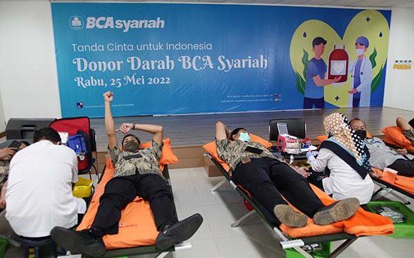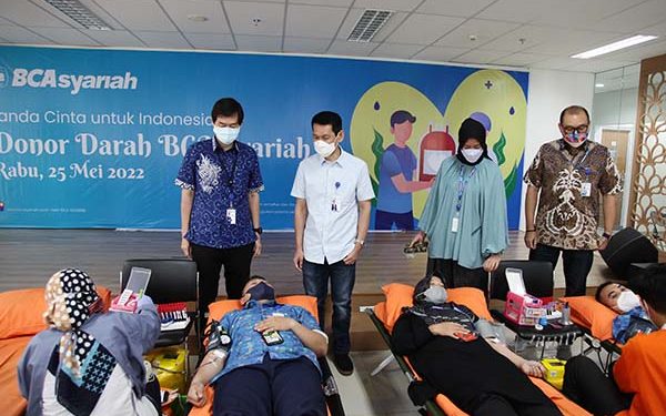 Direktur BCA Syariah Lukman Hadiwijaya, Direktur Rickyadi Widjaja, Direktur Houda Muljanti, Direktur Pranata Direktur tengah menyapa karyawan yang tengah mengikuti Donor Darah di Kantor Pusat BCA Syariah Jakarta, Rabu 15 Mei 2022. Donor Darah merupakan bagian dari kegiatan sosial perusahaan, BCA Syariah Peduli. Kegiatan ini diselenggarakan secara rutin setiap tahun bekerja sama dengan Palang Merah Indonesia dengan tujuan untuk membantu ketersediaan pasokan darah bagi masyarakat yang membutuhkan.