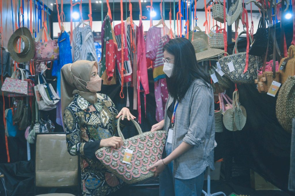 Presiden Direktur BCA Syariah Yuli Melati Suryaningrum (kiri) tengah berbincang dengan seorang pengunjung di booth UMKM peserta Program WEpreuneur BCA Syariah yang merupakan program pendampingan dan inkubasi pelaku usaha perempuan di acara Jakarta Muslim Fashion Week di Tangerang, Banten, Kamis 20 Oktober 2022.