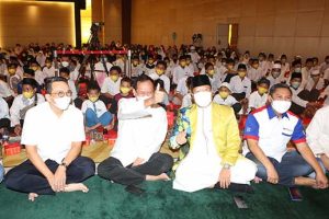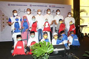 Wakil Presiden Direktur APLN sekaligus Ketua Bidang Keagamaan YAPL Noer Indradjaja (duduk) bersama AVP Corporate Human Resources APLN Hidayat Bakri, Wakil Ketua Yayasan Agung Podomoro Land Serian Wijatno, Center Director Kuningan City Christopher Hardja, Center Director Senayan City Selvyn dan Center Director Thamrin City Mualim (kiri ke kanan) tengah menyapa anak yatim di sela kegiatan santunan kepada anak-anak yatim binaan perusahaan di Jakarta. Rabu, 13 April 2022. Kegiatan ini merupakan salah satu bentuk kepedulian perusahaan terhadap masyarakat, khususnya yang berlokasi di sekitar lingkungan APLN, APG, dan unit bisnisnya. 300 anak hadir mewakili 1500 anak yatim dengan tetap menjalankan prokes mengingat kondisi masih pandemi.