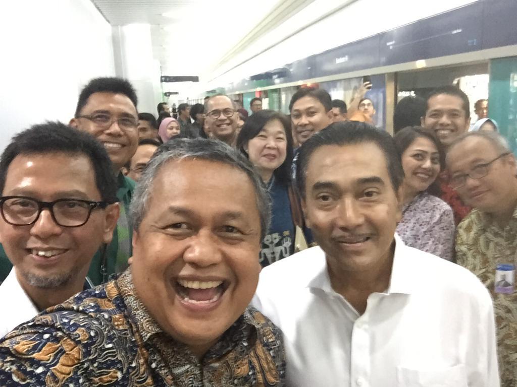 Gubernur Bank Indonesia (BI), Perry Warjiyo bersama deputi gubernur dan para bankir melakukan uji coba Mass Rapid Transit (MRT ), hari ini, Jumat, 22 Maret 2019.