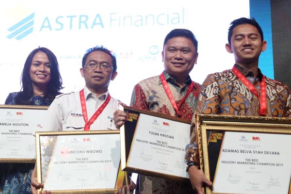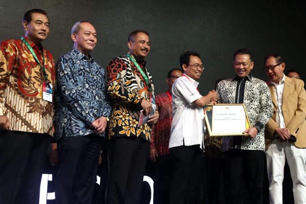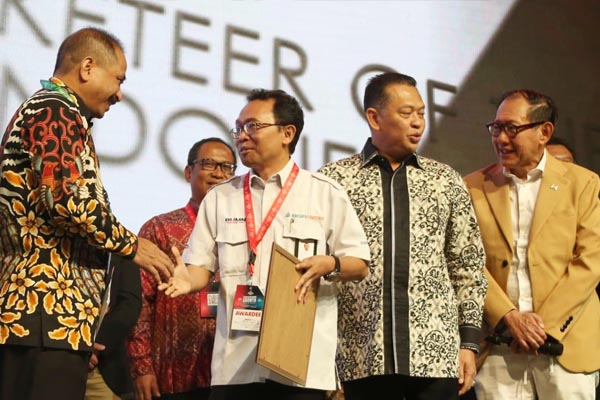 Direktur Utama BGR Logistics, M. Kuncoro Wibowo (kedua kiri) menerima penghargaan The Best Industry Marketing Champion 2019 for the Logistics sector, yang diserahkan Ketua MPR RI Bambang Soesatyo (kedua kanan) dalam ajang Industry Marketing Champion and Marketeer of The Year (MOTY) Award 2019, di Jakarta, Rabu 4 Desember 2019. Penghargaan Industry Marketing Champion and Marketeer of The Year (MOTY) Award, merupakan penghargaan ke tujuh yang diterima BGR Logistics sejak Januari 2019. Hal ini menjadi bentuk apresiasi pihak eksternal perusahaan atas transformasi yang dilakukan menjadi Digital Logistics Company sejak Oktober 2018 lalu.