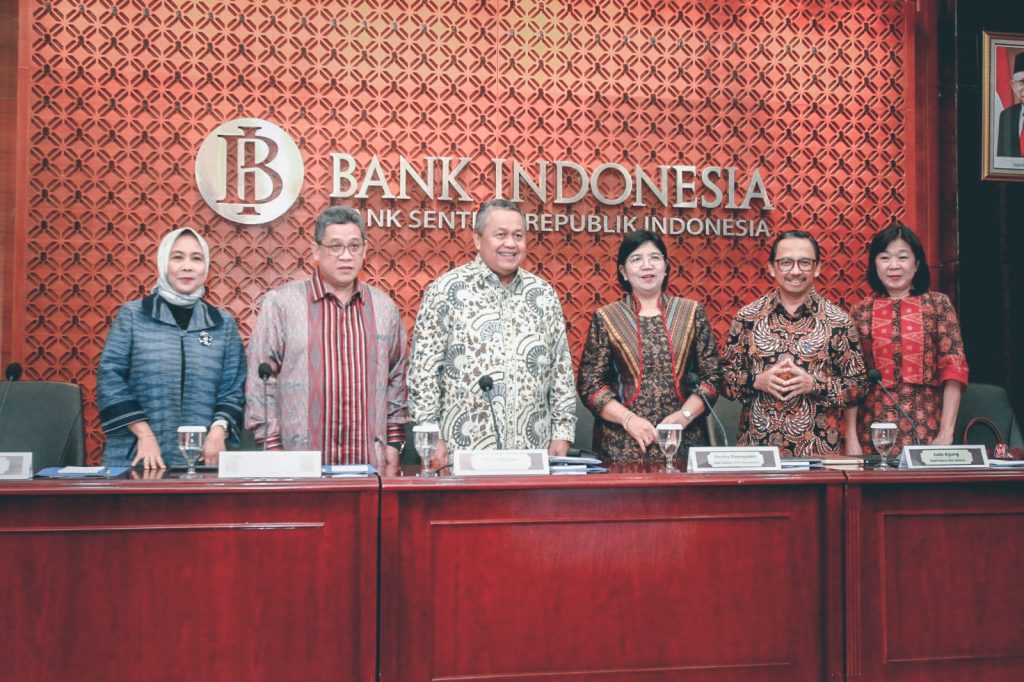 Jajaran Dewan Gubernur Bank Indonesia (BI) berfoto bersama media setelah selesai jumpa pers.