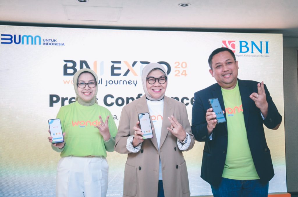 Direktur Retail Banking BNI Corina Leyla Karnalies (tengah), Consumer Segment Division Head Sri Indira (kiri), dan Ketua HUT ke-78 BNI Mesah Roni Ginting (kanan), saat Press Conference jelang BNI EXPO 2024 di Grha BNI Jakarta, Selasa, 30 Juli 2024.Direktur Retail Banking BNI Corina Leyla Karnalies (tengah), Consumer Segment Division Head Sri Indira (kiri), dan Ketua HUT ke-78 BNI Mesah Roni Ginting (kanan), memperlihatkan aplikasi wondr by BNI dalam Press Conference BNI EXPO 2024 di Grha BNI Jakarta, Selasa, 30 Juli 2024.