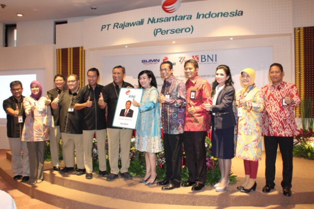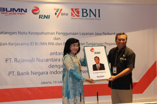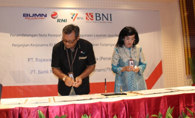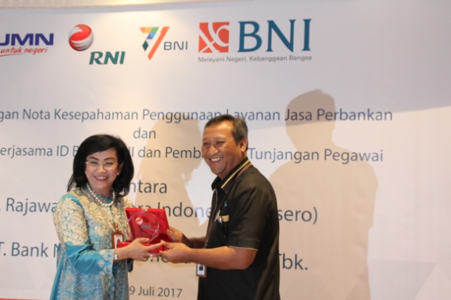 Direktur Hubungan Kelembagaan & Transaksional Perbankan BNI Adi Sulistyowati (kiri) dan Direktur Utama RNI Didiek Prasetyo saat menadatangani kerjasama di Jakarta,Rabu 19 Juli 2017.PT Bank Negara Indonesia (Persero) Tbk (BNI) terpilih menjadi bank penyedia “Kartu ID BUMN” bagi seluruh pegawai PT Rajawali Nusantara Indonesia (RNI). Kerja sama antara BNI dengan RNI ini tidak terbatas pada penyediaan Kartu ID BUMN, melainkan juga mencakup “Pembayaran dan Pengelolaan Tunjangan Pegawai, serta Penyediaan Fasilitas Kredit Konsumer bagi pegawai RNI.(Budi Urtadi)