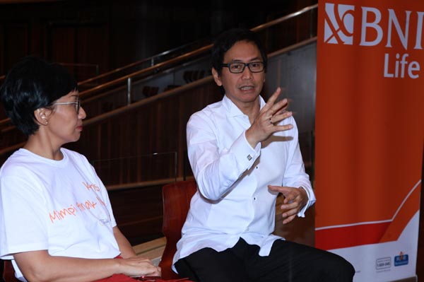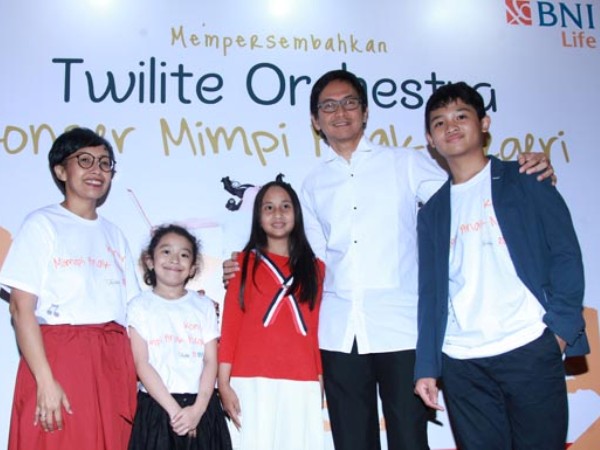 Head of Corporate Communications BNI Life, Lia Susetio dan Komposer Twilite Orchestra, Addie MS berbincang dengan anak-anak sebelum acara Konser “Twilite Orchestra – Mimpi Anak Negeri” di Aula Simfonia, Jakarta, Rabu 16 Agustus 2017. BNI Life mendukung penuh penyelenggaraan acara ini dan berharap Konser ini dapat menginspirasi orangtua agar terus mendukung pengembangan potensi anak sesuai bakat dan kemampuan yang dimiliki melalui pendidikan baik formal maupun informal. (*) Erman