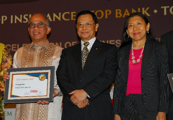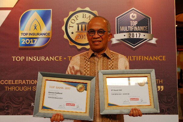 Direktur Utama Bank DKI, Kresno Sediarsi (kiri) menerima penghargaan dari Ketua Dewan Juri TOP Bank, Top Insurance dan Top Multifinance 2017, Suryo Danisworo pada kategori TOP CEO Bank 2017 dan TOP BPD BUKU III 2017 dalam acara penghargaan TOP Bank 2017 di Jakarta, 14 September 2017.