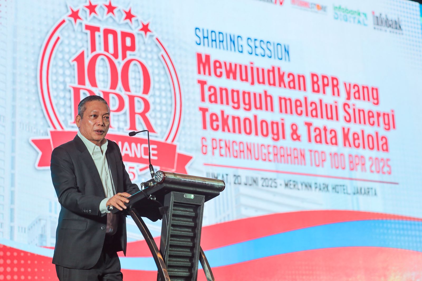 Eko B. Supriyanto, Chairman The Finance menyampaikan pidato sambutan dalam kegiatan Sharing Session dengan tema "Mewujudkan BPR yang Tangguh melalui Sinergi dan Tata Kelola", di Merlynn Park Hotel, Jakarta, Jumat, 20 Juni 2025. (Foto: Muhammad Zullfikar)