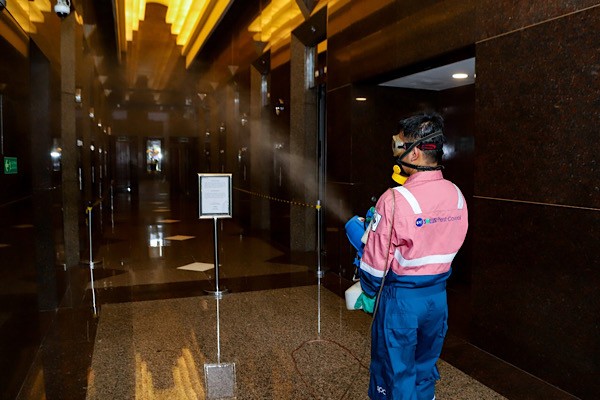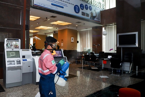 Seorang petugas tampak sedang melakukan penyemprotan disinfektan di Plaza BRI 1 dan 2 Kantor Pusat Bank BRI, Jakarta Pusat pada Minggu (15/03). Aktifitas tersebut merupakan upaya BRI untuk memberikan perlindungan terhadap kesehatan dan keselematan para pekerja BRI. Sejak COVID 19 pertama kali terdeteksi di Indonesia, BRI telah melakukan langkah langkah pencegahan di antaranya menyediakan hand sanitizer serta mengajak untuk menjalankan GERMAS. (*)