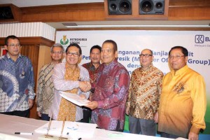 Direktur UMKM PT Bank Rakyat Indonesia (Persero) Tbk (BRI)-Mohammad Irfan dan Direktur Utama PT Petrokimia Gresik-Hidayat Nyakman menandatangani naskah kerjasama didampingi jajaran Direksi kedua perusahaan di Kantor Pusat BRI Jakarta,Jumat 18 September 2015.Pemberian fasilitas pinjaman BRI sebesar Rp.1,3 triliun kepada Petrokimia Gresik,untuk pembangunan pabrik pupuk baru.Dukungan BRI terhadap industri pupuk nasional dalam rangka meningkatkan ketahanan pangan.(Budi Urtadi)