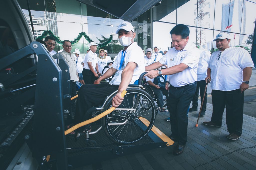 Direktur Utama BSI Hery Gunardi tengah membantu peserta BSI Mudik Bareng BUMN bersama peserta disabilitas yang diadakan di The Tower, Jakarta.