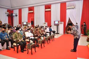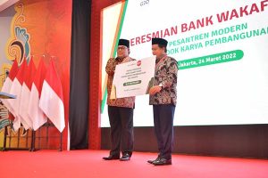 Wakil Presiden RI KH. Ma’ruf Amin (kiri) tengah berbincang dengan Direktur Utama Bank Syariah Indonesia (BSI) sekaligus Pembina LAZ BSMU Hery Gunardi (kanan) saat meresmikan Bank Wakaf Mikro di Pesantren Modern Pondok Karya Pembangunan (PKP) Jakarta, Kamis, 24 Maret 2022. BSI mendukung Otoritas Jasa Keuangan (OJK) dalam mendorong pertumbuhan Usaha Mikro Kecil dan Menengah (UMKM) di Indonesia lewat Bank Wakaf Mikro (BWM). Salah satunya dengan membentuk Bank Wakaf Mikro (BWM) pertama di DKI Jakarta yaitu BWM Syariah di Pesantren Modern Pondok Karya Pembangunan (PKP).