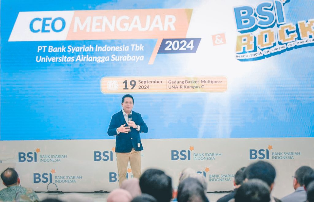 BSI gelar acara CEO mengajar di Universitas Airlangga, Surabaya, Jawa Timur, Kamis 19 September 2024. Foto BSIDirektur Utama BSI Hery Gunardi tengah memberikan materi dihadapan mahasiswa saat acara CEO mengajar di Universitas Airlangga, Surabaya, Jawa Timur.