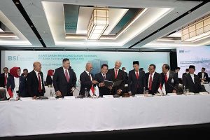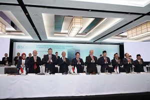 Wakil Direktur Utama 2 Bank Syariah Indonesia (BSI) Abdullah Firman Wibowo, Wadirut 1 BSI Ngatari, Direktur Utama BSI Hery Gunardi, Komisaris Utama BSI Adiwarman Azwar Karim, Wakil Komisaris Utama BSI Muhammad Zainul Majdi, dan Komisaris Independen BSI Komaruddin Hidayat saat memulai Rapat Umum Pemegang Saham Tahunan (RUPST) PT Bank Syariah Indonesia Tbk di Jakarta, Jumat, 27 Mei 2022. Sebanyak enam mata acara yang diputuskan dalam RUPS tahunan ini diantaranya persetujuan laporan keuangan tahun buku akhir Desember 2021, persetujuan penggunaan laba bersih tahun 2021, remunerasi direksi, komisaris dan Dewan Pengawas Syariah 2022, persetujuan penunjukkan kantor akuntan public, persetujuan perubahan susunan Dewan Pengawas Syariah dan persetujuan perubahan anggaran dasar.