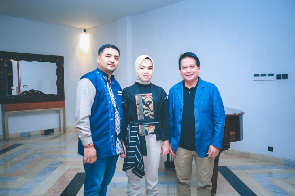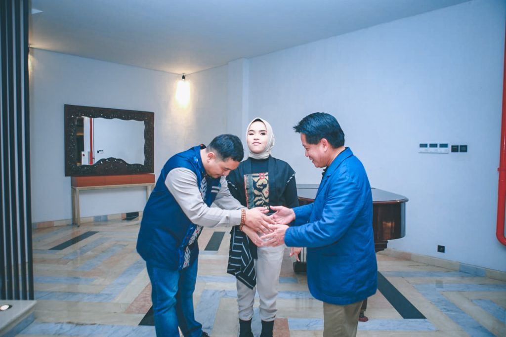 Direktur Utama PT Bank Syariah Indonesia Tbk (BSI) Hery Gunardi (kanan) berjabat tangan dengan Putri Ariani (tengah) dan ayahanda Ismawan Kurnianto (kiri) di sela acara Mata Najwa on Stage : Anak Muda Bisa Apa? di Universitas Muhammadiyah Malang, Jawa Timur.