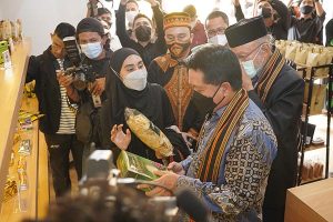 Direktur Utama PT Bank Syariah Indonesia Tbk (BSI) Hery Gunardi (kanan) bersama Wali Nanggore Aceh Paduka Yang Mulia Tengku Malik Mahmud Al Haythar (tengah) dan Staff Ahli Gubernur Aceh Bidang Perekonomian Keuangan dan Pembangunan Iskandar Syukri (kiri) saat meresmikan UMKM Centre di Banda Aceh, Rabu, 29 Desember 2021. PT Bank Syariah Indonesia Tbk (BSI) meluncurkan BSI UMKM Center di Provinsi Aceh sebagai dukungan nyata dalam mengembangkan usaha rakyat yang merupakan tulang punggung ekonomi nasional. Fasilitas dan layanan tersebut akan menjadi wadah bagi pelaku Usaha Mikro Kecil dan Menengah dalam mendapatkan pelatihan, pembinaan, pembiayaan hingga membantu proses pemasaran produk.