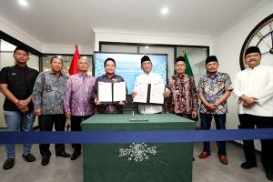 Direktur Urama BSI Hery Gunardi (ketiga kiri) dan Ketua Umum PBNU KH Yahya Cholil Staquf (ketiga kanan) tengah melakukan penandatanganan kerja sama disaksikan Direktur Wholesale Transaction Banking BSI Zaidan Novari (kiri) Direktur Retail Baking BSI Ngatari (kedua kiri), Katib ‘Aam PBNU KH Ahmad Said Asrori, Bendahara PBNU H. Gudfan Arif Ghofur (kanan), dalam acara penandatanganan nota kesepahaman antara PBNU dengan BSI di Kantor Pusat PBNU di Jakarta, 21 September 2022.