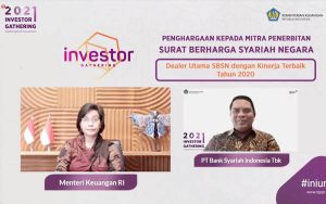 Direktur Sales & Distribution PT Bank Syariah Indonesia Tbk atau BSI (kanan) saat menerima penghargaan dari Menteri Kementerian Keuangan RI dalam acara Investor Gathering 2021 yang dihadiri Menteri Keuangan RI, Sri Mulyani (kiri) secara daring, Senin 13 Desember 2021. BSI memperoleh 2 penghargaan yaitu Dealer Utama SBSN dengan Kinerja Terbaik Tahun 2020 dan Mitra Distribusi SBSN Ritel dengan Kinerja Terbaik Tahun 2020. Hingga September 2021, BSI menjadi bank peringkat ketujuh dengan aset terbesar di Indonesia sebesar Rp251 triliun dan membukukan laba bersih sebesar Rp2,26 triliun.