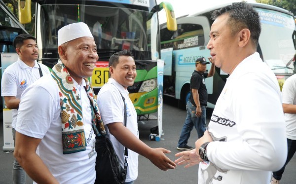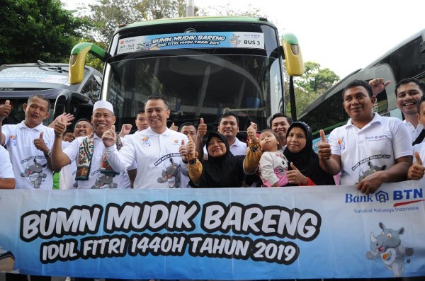 Direksi PT Bank Tabungan Negara lain (Persero) Tbk Oni Febriarto berbincang dengan peserta BUMN Mudik Bareng di Gelora Bung Karno, Jakarta, Kamis (30/5). Bank BTN memberangkatkan 2.500 pemudik dari wilayah Jakarta dan sekitarnya. Jumlah peserta mudik bareng BTN tersebut telah meningkat 66% dibandingkan tahun lalu yang hanya 1500 peserta. Bank BTN memberangkatkan pemudik, yang rata-rata adalah para karyawan/pekerja dari mitra developer, lewat jalur darat dan laut menuju sejumlah wilayah di Jawa seperti Solo, Surabaya dan Makassar. (*)