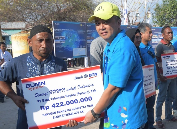 Plt Direktur Utama Bank BTN Oni Febriarto menyerahkan bantuan corporate social responsibility (CSR) di wilayah Nusa Tenggara Timur (NTT) senilai Rp 422 Juta. Bantuan CSR tersebut dialokasikan antara lain untuk membantu renovasi homestay di desa Panjang Kabupaten Manggarai Barat, NTT dan renovasi Pura Agung Giri Kertha Bhuwana di Kupang serta bantuan elektrifikasi di NTT yang akan dimanfaatkan sekitar 400 kepala keluarga di wilayah itu. Kegiatan ini dilakukan bersamaan dengan pelaksanaan Rapat Koordinasi BUMN yang dipusatkan di Labuan Bajo, NTT pada tanggal 5 – 7 Oktober 2019. (*)