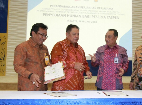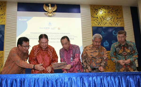 Direktur Utama PT Bank Tabungan Negara (Persero) Tbk, Maryono (tengah) bersama Direktur Utama PT Taspen (Persero), Iqbal Latanro (dua dari kiri) dan Direktur Utama PT Bank Mandiri Taspen, Josephus K Triprakoso (kiri) menandatangani Perjanjian Kerja sama dalam rangka pemberian fasilitas KPR kepada peserta Taspen di Gedung Taspen, Jakarta, Senin (12/2). Kerja sama ini merupakan sinergi antar BUMN yang diarahkan untuk pemenuhan kebutuhan rumah peserta Taspen. Dalam kerja sama tersebut Bank BTN membidik 6,7 juta peserta Taspen untuk penyaluran KPR dengan suku bunga KPR khusus, yaitu sebesar 8% fixed untuk 3 tahun dan 9% berlaku fixed selama 5 tahun. (*)