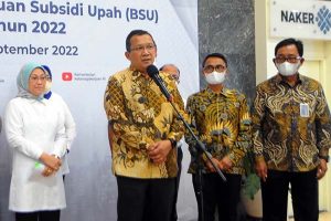 Menteri Ketenagakerjaan RI Ida Fauziah (kanan) berbincang dengan Direktur Utama PT Bank Tabungan Negara (Persero) Tbk, Haru Koesmahargyo (kiri) dan Wakil Menteri Ketenagakerjaan RI, Afriansyah Noor (tengah) di sela-sela acara Penandatanganan Perjanjian Kerjasama Penyaluran Bantuan berupa Subsidi Gaji/ UPAH bagi Pekerja/Buruh tahun Anggaran 2022 di Jakarta, Selasa (6/9). Bank BTN resmi menjadi salah satu bank penyalur Bantuan Subsidi UPAH (BSU). BTN berkomitmen mendistribusikan BSU sesuai ketentuan Pemerintah kepada pekerja yang memenuhi syarat sebagai penerima BSU.