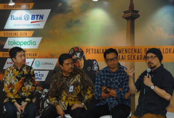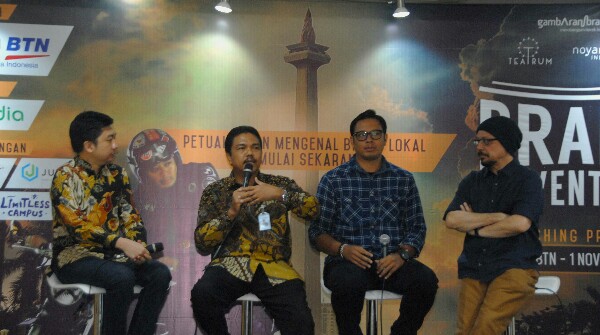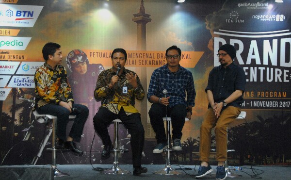 Managing Director Distribution & Network PT Bank Tabungan Negara (persero) Tbk, Budi Satria bersama Co-Founder dan CEO Tokopedia William Tanuwijaya, Founder & CEO Gambaran Brand Arto Soebiantoro, serta Executive Producer Brand Adventure Andi F Noya berbincang dalam Launching Program Brand Adventure di Menara BTN, Jakarta, Rabu (1/11). Bank BTN siap memberikan dukungan dalam pengembangan brand lokal untuk tumbuh dan besar di negeri sendiri melalui jaringan digital perseroan. Brand lokal di era digitalisasi diharapkan dapat tumbuh berkembang kompetitif di kancah brand kelas dunia. (*)