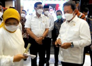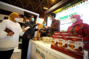 Direktur Consumer & Commercial Lending Bank BTN Hirwandi Gafar bersama Menteri Koordinator Bidang Kemaritiman dan Investasi Luhut Binsar Pandjaitan, Menteri Kelautan dan Perikanan Wahyu Sakti Trenggono (dua kiri) serta Gubernur Aceh Nova Iriansyah meninjau UMKM pemenang Lomba Inovasi Menu Ikan VS Kopi dalam acara Kampanye Gerakan Nasional Bangga Buatan Indonesia (Gernas BBI), di Banda Aceh, Rabu, 8 September 2021. Bank BTN sesuai fokus bisnisnya pada pembiayaan perumahan sudah melakukan pemberian dukungan terhadap UMKM yang memiliki kaitan dengan sektor pendukung perumahan. Perseroan berkomitmen memberikan dukungan layanan dari segi permodalan, layanan transaksi untuk mendorong inklusi keuangan dan edukasi transaksi digital bagi pelaku usaha UMKM agar mampu bertahan dan bersaing di pasar domestik dan berharap pelaku UMKM mampu merambah potensi bisnis di mancanegara.