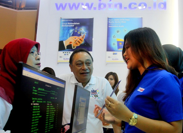 Direktur Utama Bank BTN Maryono (tengah) bersama Wakil Rektor III Universitas Diponegoro Budi Setiyono dan Ibu Kartika Basuki Hadimuljono (kiri) melakukan transaksi pengisian uang elektronik Blink Bank BTN usai membuka UBC Expo 2017 di Jakarta, Sabtu (18/11/2017). UBC Expo 2017 digelar untuk menguatkan jaringan komunitas bisnis antar alumni Undip dalam mendukung penguatan sektor ekonomi menengah. Bank BTN memberikan dukungan atas prakarsa komunitas ini untuk mendukung gerakan ekonomi nasional dalam transaksi elektronik melalui layanan elektronik BTN. (*)