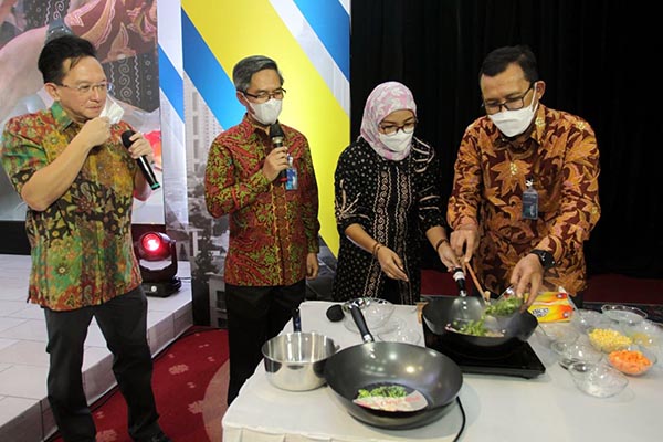 Direktur Utama PT Bank Tabungan Negara (Persero) Tbk. Haru Koesmahargyo (kanan) memasak menggunakan kompor induksi disaksikan Direktur Maspion Group Jocobus Lindy Salim (kiri) dan Direktur Niaga dan Manajemen Pelanggan PT Perusahaan Listrik Negara (Persero) Bob Saril (kedua kiri) dalam acara Ayo Investasi Properti di Kawasan Transit Oriented Development (TOD) dan Launching KPR/KPA Platinum Bundling Kompor Induksi bersama Bank BTN di Jakarta, Rabu, 28 April 2021. Bank BTN menggandeng 5 pengembang besar dengan proyek TOD untuk mendukung Gerakan 1 Juta Kompor Induksi. Melalui kemitraan tersebut, seluruh hunian di TOD yang dibiayai Bank BTN dari pengembang tersebut akan mendapatkan fasilitas kompor induksi. Ke depannya, Bank BTN akan terus menggandeng pengembang pengembang lainnya baik subsidi maupun non subsidi dalam rangka mendukung Gerakan 1 Juta Kompor Induksi.