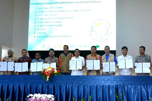 Direktur PT Bank Tabungan Negara (Persero) Tbk, Budi Satria bersama Kepala Badan Nasional Penanggulangan Bencana (BNPB) Doni Monardo (tengah) dan Kepala Divisi Commercial Funding and Services Division (CMFD) Bank BTN Anton Rijanto (kanan) usai Penandatanganan Nota Kesepahaman (Memorandum of Understandinng/MoU) antara BNBP dengan Bank BTN di Lembang, Jawa Barat, Jumat (26/4). Melalui penandatanganan MoU tersebut, Bank BTN mendukung BNPB dalam menanggulangi bencana mulai dari kondisi pra bencana, tanggap darurat, hingga pasca bencana. Lewat kemitraan ini, Bank BTN juga memberikan berbagai layanan perbankan untuk menanggulangi bencana. Bank BTN juga akan memberikan berbagai jasa pengelolaan dana bagi institusi BNPB maupun para karyawan lembaga tersebut. (*)