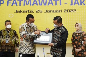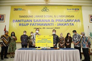 Direktur Utama Bank BTN Haru Koesmahargyo didampingi Direktur Distribution and Retail Funding Bank BTN Jasmin (kanan) memberikan bantuan tanggung jawab sosial dan lingkungan (TJSL) secara simbolis kepada Direktur Utama Rumah Sakit Fatmawati Andi Saguni di Jakarta, Rabu, 26 Januari 2022. Bank BTN menyalurkan TJSL kepada Rumah Sakit Fatmawati berupa Bantuan Sarana dan Prasarana, diharapkan dengan bantuan tersebut bisa mewujudkan keinginan Rumah Sakit Fatmawati untuk menjadi Rumah Sakit Nomor Satu di Indonesia. Selain memberikan bantuan TJSL, Bank BTN siap memberikan layanan jasa perbankan kepada Rumah Sakit Fatmawati baik berupa pendanaan maupun pembiayaan perumahan untuk para karyawan.