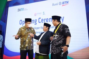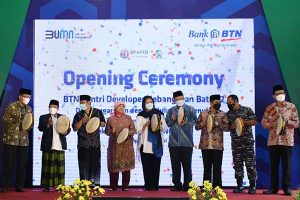 Direktur Utama Bank BTN Haru Koesmahargyo (kedua kiri) didampingi Direktur Finance, Planning and Treasury Bank BTN Nofry Rony Poetra (kiri) berbincang dengan Pengurus Pesantren Khas Kempek KH Mustofa Aqil Siroj (tengah) Wakil Ketua MPR RI Asrul Sani (kedua kanan) dan Ketua Umum NU Circle Gatot Prio Utomo usai peresmian pembukaan BTN Santri Developer Kebangsaan di Pondok Pesantren Khas Kempek, Cirebon, Jawa Barat, Sabtu, 29 Januari 2022. Kegiatan ini merupakan bath kedua yang diselenggarakan oleh Bank BTN sebagai bentuk sinergi antara Bank BTN dan NU Circle dalam mencetak Santri Developer yang diharapkan dapat mengurangi angka backlog perumahan di Indonesia yang mencapai 11 juta unit.