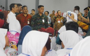 Direktur Utama Bank BTN yang juga Ketua Himbara Maryono berbincang dengan Presiden Joko Widodo, Menteri Sosial Khofifah Indar Parawansa dan Menteri Pendidikan dan Kebudayaan Muhadjir Effendy menyerahkan secara simbolis bantuan sosial Program Keluarga Harapan (PKH) kepada keluarga penerima manfaat di Kota Cilegon, Banten, Kamis (5/10).