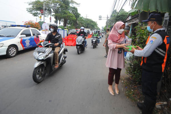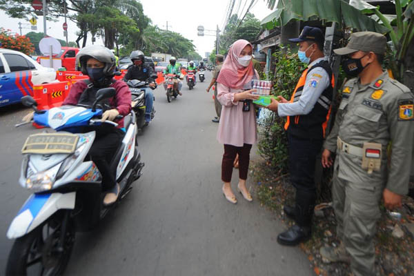 Beberapa pegawai PT Bank Tabungan Negara (Persero) Tbk. membagikan makanan dan hand sanitizer kepada petugas yang menjaga area penyekatan di kawasan Samsat Daan Mogot, Jakarta, Kamis, 22 Juli 2021. Selama masa PPKM Darurat, Bank BTN ikut peduli terhadap keselamatan petugas di titik penyekatan dengan membagikan masker, hand sanitizer, dan juga makanan. Sampai dengan 15 Juli 2021, Bank BTN tercatat juga telah menyalurkan dana Bansos dari Kementerian Sosial senilai Rp433,77 miliar yang diharapkan dapat membantu pemerintah dalam meringankan beban rakyat terdampak pandemi covid19.