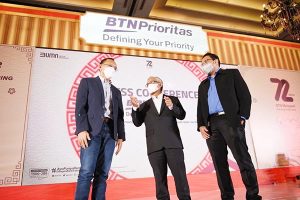 Direktur Distribution and Retail Funding Bank BTN Jasmin (tengah) berbincang dengan Kepala Divisi Wealth Management Bank BTN Frengky Rosadrian dan Segmentation Department Head Wealth Management Divison (WMD) Bank BTN Yan Ananto Hutomo Putro pada saat konfrensi pers relaunching BTN Prioritas di Jakarta, Rabu, 2 Februari 2022. BTN Prioritas dengan tagline baru Defining Your Priority meluncurkan layanan PLUS (Platform Loyalty User) yang memanjakan nasabah dengan berbagai pilihan loyalty. Dengan layanan PLUS ini BTN Prioritas optimistis dapat meraih dana kelolaan hingga akhir tahun 2022 sekitar Rp45,9 triliun.