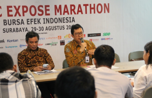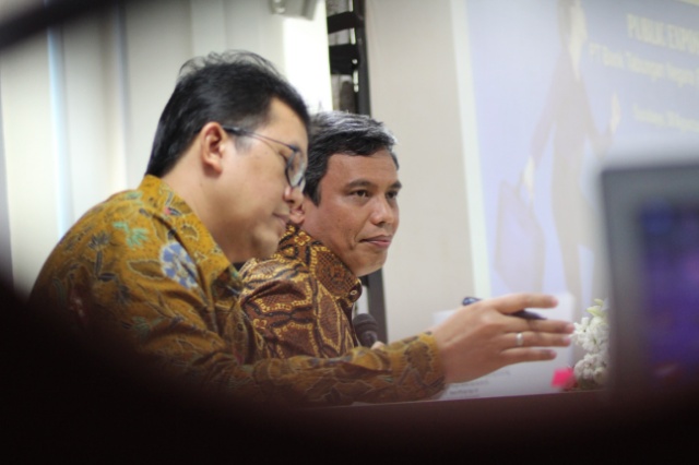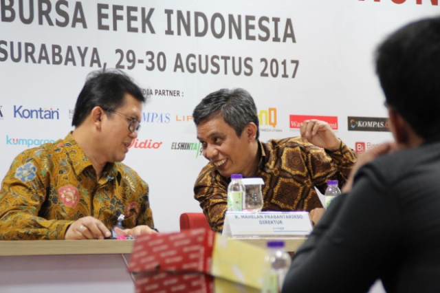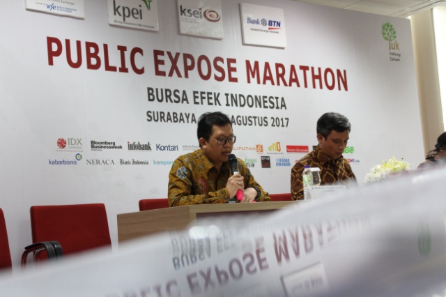 (Kiri-kanan) Direktur PT Bank Tabungan Negara (Persero) Tbk (BTN) R Mahelan Prabantarikso dan Direktur BTN Nixon LP Napitupulu saat PT Bank Tabungan Negara Persero Tbk menggelar public expose marathon yang diselenggarakan di Gedung Perwakilan Bursa Efek Indonesia di Surabaya Rabu 30 Agustus 2017. BTN optimis kinerja perusahaan akan terus meningkat sampai dengan akhir tahun sesuai dengan kepercayaan investor dari harga saham BBTN yang ditutup pada 30/8 menyentuh rekor baru saham BBTN di angka 2.950. Potensi bisnis pembiayaan perumahan di Surabaya menjadi fokus manajemen untuk mendorong optimalisasi pertumbuhan kredit perseroaan dengan menggandeng pengembang di wilayah jawa timur untuk bersama membangun rumah untuk rakyat.