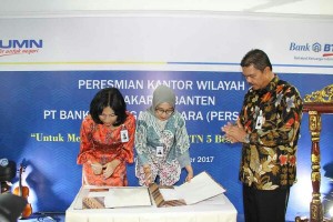 Komisaris Utama PT Bank Tabungan Negara (Persero) Tbk (BTN), I Wayan Agus Mertayasa (kiri) didampingi Managing Director Network & Distribution Budi Satria, Kepala Kantor Wilayah 2 Jakarta-Banten, Dewi Fitrianingrum (tengah) bersama Managing Director Consumer Banking, Handayani (kedua dari kanan) dan Direktur Keuangan dan Treasury Iman Nugroho Soeko (kanan) meresmikan Kantor Wilayah 2 Jakarta-Banten. Regionalisasi Kantor wilayah 2 Jakarta-Banten sebagai salah satu strategi bisnis korporasi yang bertujuan untuk mempermudah koordinasi, kontrol, dan efisiensi biaya.