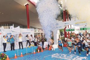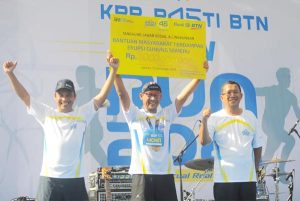 Direktur Utama PT Bank Tabungan Negara (Persero) Haru Koesmahargyo (ketiga dari kiri), Komisaris Bank BTN, Iqbal Latanro (kedua dari kiri) dan Wakil Direktur Utama Bank BTN, Nixon LP Napitupulu (kiri) mengangkat bendara start atau flag off saat acara BTN RUN 2021 Charity For Semeru dalam rangka HUT KPR 45 Semeru di Serpong, Banten, Minggu (12/12). Acara BTN RUN 2021 yang diselenggarakan sesuai prokes tersebut diikuti sekitar 2.000 peserta baik yang hadir langsung maupun yang lari secara virtual. Seluruh Peserta BTN Run yang sudah mengikuti test antigen juga turut menyumbangkan 45.000 rupiah per 1 kilometernya untuk korban bencana erupsi Gunung Semeru dengan total sumbangan mencapai Rp 1 miliar.