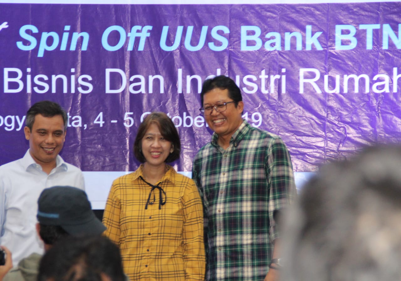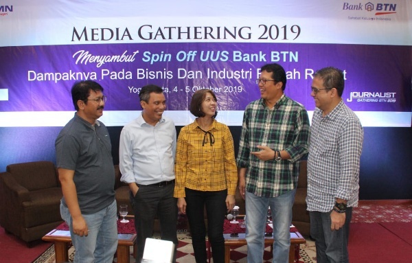 Direktur Treasury PT Bank Tabungan Negara (Persero) Tbk. Nixon L. P. Napitupulu (kiri), Chief Economist Bank BTN Winang Budoyo dan Direktur Eksekutif Asosiasi Analis Efek Indonesia (AAEI) Haryajid Ramelan (kanan) ketika menjadi nara sumber dalam acara Media Gathering Bank BTN di Yogyakarta, Jumat (4/10). Bank BTN bersiyap segera merealisasi aksi korporasi spin-off Unit Usah Syariah (UUS) perseroan. Langkah spin-off tersebut dilakukan sebagai pengembangan sekaligus penguatan bisnis BTN Syariah ke depannya sesuai dengan arahan OJK. Adapun, sesuai dengan tahapan yang sudah disiapkan perseroan, aksi pemisahan tersebut diperkirakan akan rampung pada Desember 2020 dengan kebutuhan dana sekitar Rp4,5 triliun. (*)
