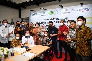 Menteri BUMN Erick Thohir (kedua kiri) bersama Direktur Utama Bank BTN Haru Koesmahargyo (kiri) berbincang dengan para atlit paralimpic usai menyaksikan serah terima unit hunian di Jakarta, akhir pekan lalu Menteri BUMN melalui Bank BTN selaku koordinator dan 4 BUMN Donatur masing-masing PT Krakatau Steel, PT Pembangunan Perumahan, PT Kawasan Berikat Nusantara dan PT Asuransi IndonesiaRe memberikan apresiasi kepada 9 atlit juara paralimpic di Tokyo tahun lalu. Adapun masing-masing atlit tersebut diberikan satu unit apartemen full furnish dan free IPL selama satu tahun di apartemen Mahatta Semesta Depok yang sudah menerapkan konsep TOD atau transit oriented development.