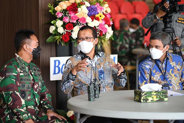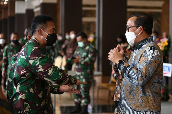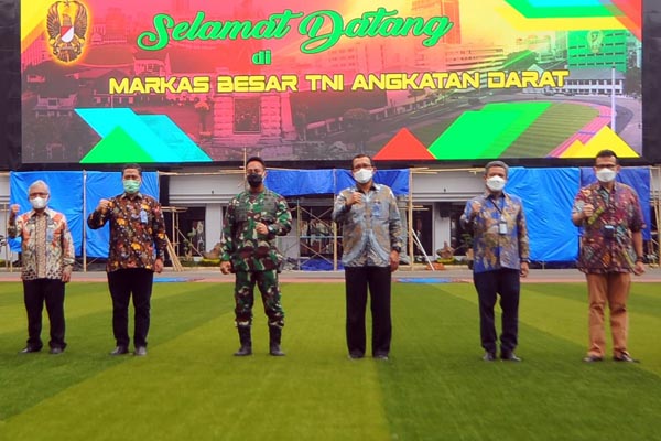 Direktur Utama PT Bank Tabungan Negara (Persero) Tbk. Haru Koesmahargyo bersama Kepala Staf Tentara Nasional Indonesia Angkatan Darat (TNI AD), Andika Perkasa menyaksikan penandatanganan perjanjian kerja sama Tabungan Wajib Perumahan Angkatan Darat (TWP AD) yang dilakukan oleh Direktur Distribution & Retail Funding Bank BTN, Jasmin dan Asisten Personalia Kepala Staf Angkatan Darat Mayor Jendral TNI Mulyo Aji di Jakarta, Jumat, 16 April 2021. Melalui kerja sama ini, Bank BTN menyatakan siap membiayai sekitar 10.000 unit rumah setiap tahun untuk para anggota TNI AD dengan skema yang lebih mudah dan murah. BTN juga akan melayani kebutuhan perbankan one stop solution bagi TNI AD.