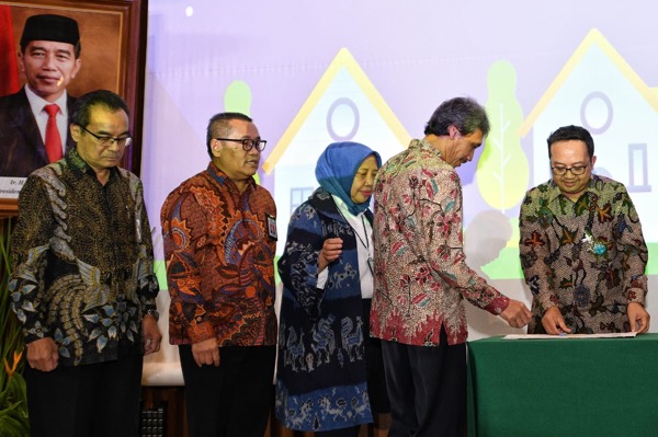 Direktur Utama Bank BTN Pahala N Mansyuri berbincang dengan Sekjen Kementerian Pekerjaan Umum dan Perumahan Rakyat, Anita Firmanti Eko Susetyowati (kedua kiri), Dirjen Penyediaan Perumahan Kementerian PUPR Khalawi Abdul Hamid (kedua kanan) dan Dirjen Pembiayaan Infrastruktur Kemenyerian PUPR Eko D Heripurwanto (kanan) usai acara Penandatanganan Perjanjian Kerjasama Operasi Fasilitas Likuiditas Pembiayaan Perumahan (FLPP) tahun anggaran 2020 di Kantor Kementerian PUPR, Jakarta, Kamis (19/12). Dengan penandatanganan tersebut, Bank BTN kembali dipercaya Pemerintah mengemban tugas sebagai penyalur KPR Subsidi bagi Masyarakat Berpenghasilan Rendah (MBR) untuk menyukseskan Program Sejuta Rumah. Bank BTN menjadi bank penyalur FLPP terbesar diantara 37 bank yang menjadi mitra pemerintah untuk menyalurkan dana FLPP. (*)