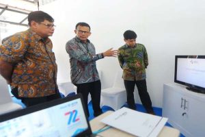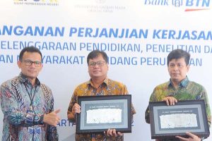 Direktur Finance PT Bank Tabungan Negara (Persero) Tbk. Nofry Rony Poetra (tengah) bersama Dekan Fakultas Teknik Universitas Gadjah Mada (FT UGM) Selo (kiri) dan Kepala Balai Pelaksana Penyediaan Perumahan Jawa III Direktorat Jenderal Perumahan Kementerian PUPR Salahudin Rasyidi (kanan) memamerkan naskah Perjanjian Kerja Sama (PKS) tentang Penyelenggaraan Pendidikan, Penelitian, dan Pengabdian Masyarakat di Bidang Perumahan di Yogyakarta, Jumat (29/7). Bank BTN, Kementerian PUPR, dan FT UGM berkolaborasi mendukung inisiasi Klinik Rumah Swadaya (KRS) di kawasan perguruan tinggi UGM. Melalui klinik tersebut, masyarakat yang ingin membangun rumah secara mandiri bisa mendapatkan layanan informasi dan pendampingan secara gratis. Informasi dan pendampingan yang diberikan mulai dari desain rumah, kebutuhan biaya, perizinan, hingga proses pembangunan.