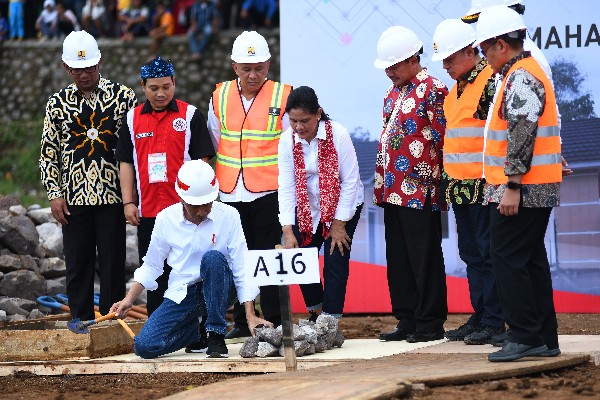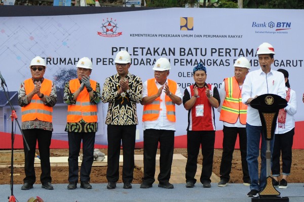 Presiden Republik Indonesia, Joko Widodo dan isteri bersama Direktur Utama PT Bank Tabungan Negara (Persero) Tbk, Maryono, Menteri Pekerjaan Umum dan Perumahan Rakyat Basuki Hadimuljono, Menteri Sosial Agus Gumiwang Kartasasmita, Gubernur Jawa Barat Ridwan Kamil dan Bupati Garut Rudy Gunawan serta Ketua Persaudaraan Pencukur Rambut Garut (PPRG) Irawan Hidayah meletakkan batu di area perumahan PPRG di desa Sukamukti, Banyuresmi, Garut, Jawa Barat, Sabtu (19/1).
