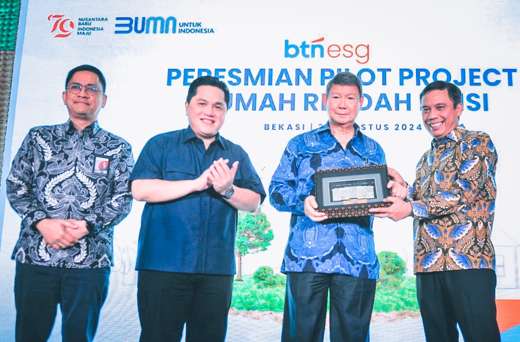 Direktur Utama PT Bank Tabungan Negara (Persero) Tbk Nixon LP Napitupulu (kiri) tengah menjelaskan Pilot Project Rumah Rendah Emisi dihadapan Ketua Satgas Perumahan Presiden terpilih Prabowo Subianto, Hashim S. Djojohadikusumo dan Menteri BUMN Erick Thohir di acara Pilot Project Rumah Rendah Emisi di Perumahan Mutiara Gading City, Bekasi, Jawa Barat.Ketua Satgas Perumahan Presiden terpilih Prabowo Subianto, Hashim S. Djojohadikusumo (tengah), Menteri BUMN Erick Thohir (kedua kiri) Direktur Utama PT Bank Tabungan Negara (Persero) Tbk Nixon LP Napitupulu (kedua kanan) menandatangani Prasasti Peresmian Rumah Rendah Emisi disaksikan Direktur Jenderal Pembiayaan Infrastruktur Kementerian PUPR Triono Junoasmono (kiri) dan Kepala Perwakilan Perserikatan Bangsa-Bangsa di Indonesia Gita Sabharwal (kanan), di acara Pilot Project Rumah Rendah Emisi di Perumahan Mutiara Gading City, Bekasi, Kamis 29 Agustus 2024.