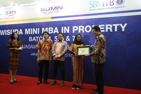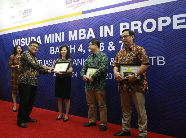 Direktur PT Bank Tabungan Negara (Persero) Tbk, R. Mahelan Prabantarikso didampingi Dekan School of Business Management Intitut Teknologi Bandung (SBM ITB), Sudarso Kaderi Wiryono menyerahkan sertifikat kepada para peserta paling berprestasi dari Program Mini MBA in Developer di Jakarta, Sabtu (24/2). Program Mini MBA in Developer merupakan hasil kerjasama Bank BTN dengan SBM ITB sejak tahun 2015 lalu. Sejak dibuka, Bank BTN telah mewisuda 328 orang calon developer. Program pelatihan dan pendidikan untuk calon developer merupakan bagian dari misi Bank BTN lewat Housing Finance Center meningkatkan kualitas SDM di bidang properti di Indonesia sekaligus mendukung program satu juta rumah. (*)