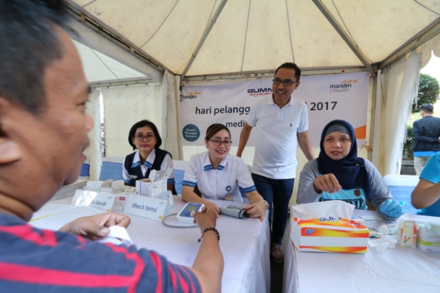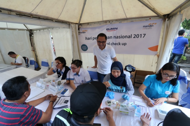Direktur Utama Mandiri Inhealth Iwan Pasila menyaksikan para pengunjung booth Mandiri Inhealth saat pemeriksaan kesehatan gratis di peringatan hari pelanggan nasional bersama Bank Mandiri dan seluruh perusahaan anak di kawasan Thamrin ,Jakarra Minggu 3 September 2017.Pemeriksaan kesehatan gratis merupakan salah satu bentuk dedikasi Mandiri Inhealth dalam menyehatkan negeri,juga berkomitmen dukung upaya pemerintah menuju tercapainya Universal Health Coverage di tahun 2019.Produk Managed Care ,merupakan produk unggulan Mandiri Inhealth dengan skema Cooerdination of Benefit (COB) menjadi solusi do era jaminan Kesehatan Nasional (JKN).Di akhir Juli 2017 lebih dari 1110 Badan Usaha BUMN dan Swasta serta 1,4 juta peserta yang sudah memperoleh perlindungan asuransi kesehatan dan jiwa dari Mandiri Inhealth.