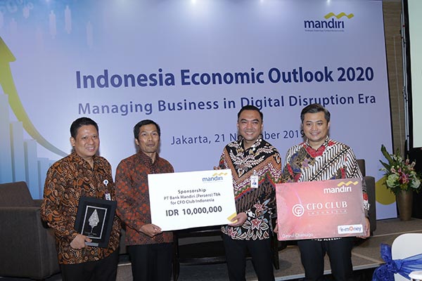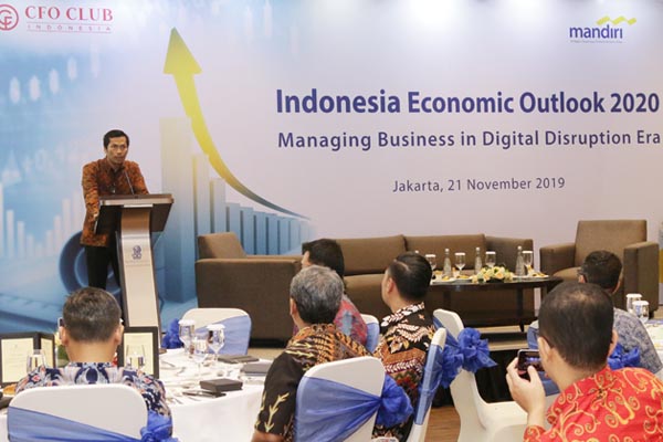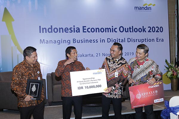 SVP Transaction Banking Retail Sales Bank Mandiri Thomas Wahyudi, President CFO Club Indonesia Dasrul Chaniago, SVP Transaction Banking Wholesale Sales Tri Nugroho dan Chief Economist Bank Mandiri Andry Asmoro (kiri ke kanan) berbincang di acara Indonesia Economic Outlook 2020 di Jakarta, Kamis 21 November 2019. Event ini merupakan ajang yang digelar CFO Club Indonesia dan didukung Bank Mandiri serta dihadiri oleh sekitar 100 CFO perusahaan asing dan lokal. Selain proyeksi kondisi ekonomi 2020, acara ini juga membahas tentang tantangan dan potensi bisnis dari booming digital teknologi di Tanah Air.