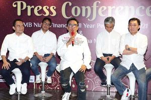 President Director CIMB Niaga Finance Ristiawan Suherman (tengah) berbincang dengan Finance and Strategy Director Imron Rosyadi, Collection and Recovery Director Danis Bimawan, Credit and Risk Director Antonius Herdaru, dan Sales and Acquisition Director Kurniawan Kartawinata (kiri ke kanan) saat paparan kinerja Tahun 2021 dengan media di Jakarta, Senin, 11 April 2022. CIMB Niaga Auto Finance melaporkan perolehan total pembiayaan baru sebesar Rp 5,67 triliun pada 2021, angka ini naik sebesar 51,3 persen secara year-on-year dibandingkan tahun 2020 sebesar Rp 3,75 triliun.